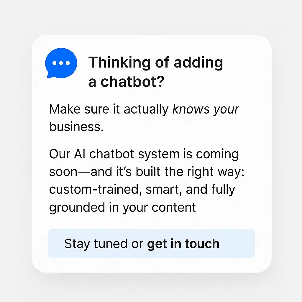 Our AI chatbot system is coming soon—and it’s built the right way: custom-trained, smart, and fully grounded in your content.